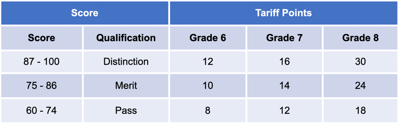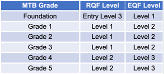 MTB music grades from Grade 1 to Diplomas (AMTB and LMTB) are assigned RQF levels, making them recognised parts of the UK’s official education system.